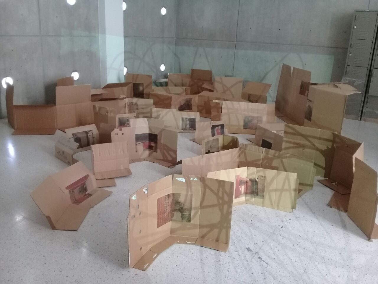 24 cajas de cartón intervenidas con transfer de fotografía con la sobre posición de un video.